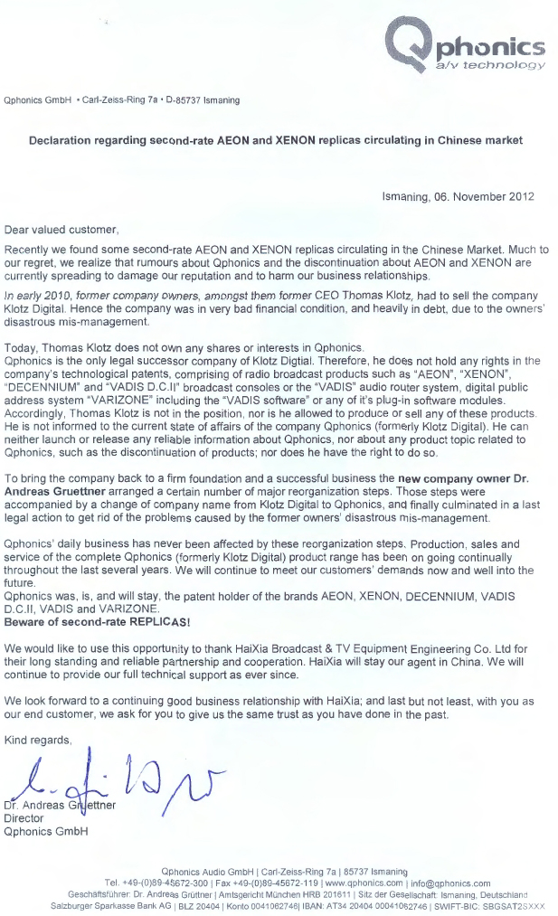 在2010年初,由于當時klotz Digital公司所有者們的管理不善,公司當時財政狀況非常的差,欠下許多債務。公司當時的CEO,Thomas Klotz(托馬斯克洛斯),做為公司的所有者的一員,在無奈之下,不得不賣掉klotz Digital公司。但是到了今天,Thomas Klotz(托馬斯克洛斯)在Qphonics公司(即之前的Klotz Digital)客戶已不再擁有任何股份。因此Thomas Klotz(托馬斯克洛斯)無權(quán)使用該公司的任何技術(shù)專利,這些專利包括我們目前的主要廣播設備產(chǎn)品,如AEON,XENON,DECENNIUM和VADIS D.C.II調(diào)音臺,VADIS的調(diào)音頻路由器系統(tǒng)與VARZONE的擴聲系統(tǒng),包括VADIS software軟件和其他即插即用軟件配件。綜上所說,Thomas Klotz(托馬斯克洛斯)無資格,也不允許從事產(chǎn)品的生產(chǎn)銷售。同時Qphonics公司內(nèi)部的情形他更不可能再知道了,再談不上他可以得到任何與Qphonics公司或公司產(chǎn)品有關(guān)的可靠信息。就像他說某某產(chǎn)品停產(chǎn)了,他從何得知?他無權(quán)散布這樣的謠言。