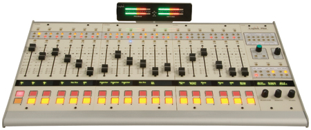 我們現(xiàn)在使用的是Logitek 16路數(shù)字調(diào)音臺,如下圖所示,這是一個調(diào)音臺的推子模塊,里面包含了兩路推子,可以看到這里有很多功能鍵,我們用到的就是推子的開關(guān)鍵ON/OFF、推子、CUE本機預(yù)聽和液晶顯示屏