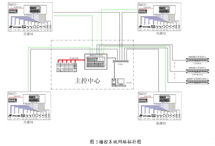 其它需要實時播出信號的部門,諸如錄制機房、網(wǎng)絡(luò)播出機房、有線播出機房、審聽間等,可以通過DHD路由控制單元使用網(wǎng)線直接連至主控中心的光纖交換矩陣(見圖3中DHD路由控制單元的連接),來獲取所需的播出信號。