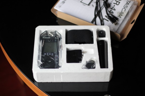 圖三:內(nèi)盒是硬質(zhì)泡沫與硬質(zhì)紙皮夾層。里面包含錄音機(jī)本體、海綿防噴罩、電源適配器(包含偏頭和圓頭兩種規(guī)格的接頭)、手持配件以及熱靴轉(zhuǎn)接頭(用于相機(jī)連接)。