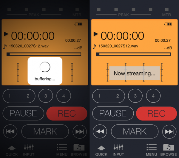 圖二十一:使用Streaming功能在手機(jī)上試聽DR-44WL上錄制的音頻,需要幾秒鐘的緩沖,然后播放的時候會顯示正在Streaming。不過目前這個功能還有一個bug,在進(jìn)行緩沖的時候,DR-44WL已經(jīng)開始播放了,造成播放時APP與DR-44WL上的走帶時間不同步,應(yīng)該會在今后的更新中修復(fù)。