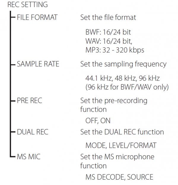 不僅如此,DR-44支持“雙重錄音”,雙重錄音的意思是可以同時錄制“不同格式”或者“不同電平”的兩組錄音。在REC Setting中可以看到DUAL REC的設(shè)定。