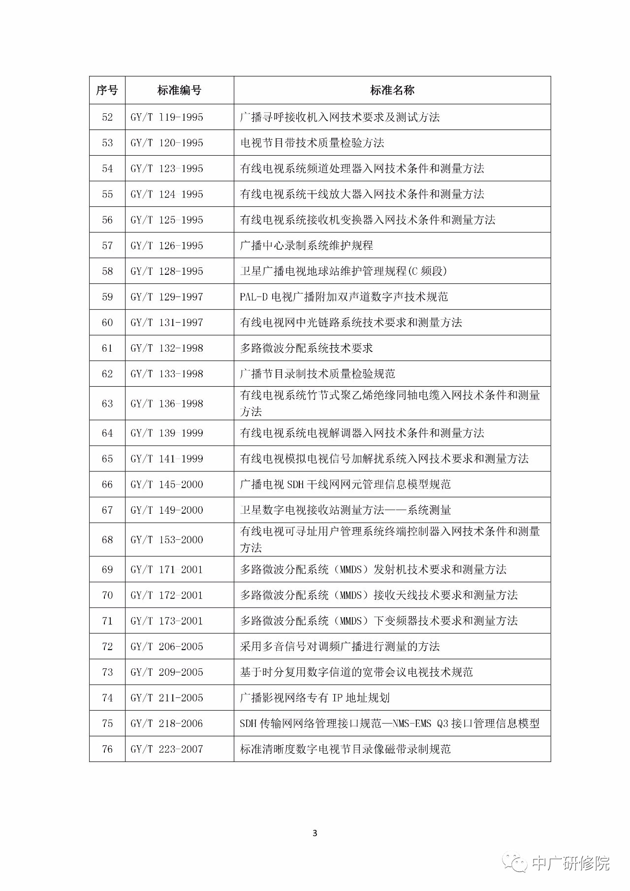 為充分發(fā)揮廣播電視技術(shù)標(biāo)準(zhǔn)的指導(dǎo)和規(guī)范作用,進(jìn)一步加強(qiáng)廣播電視標(biāo)準(zhǔn)化工作,根據(jù)《標(biāo)準(zhǔn)化法》有關(guān)規(guī)定,總局組織對(duì)2014年及之前的廣播電視技術(shù)標(biāo)準(zhǔn)進(jìn)行了復(fù)審清理,決定廢止《廣播電視專用微波接力電路傳輸體制》(GY/T 4-1982)等76項(xiàng)廣播電視行業(yè)標(biāo)準(zhǔn)(具體清單見附件),現(xiàn)予以公布,自公布之日起生效。