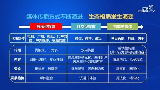 這種類(lèi)型是以頭條系、抖音和快手為代表的短視頻平臺(tái)。其典型的特點(diǎn)是反饋式傳播,根據(jù)受眾的畫(huà)像、受眾以往的行為特點(diǎn)形成算法,精準(zhǔn)推送。這種媒體就可以做到千人千面,這是跟以往媒體不一樣的。