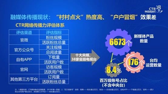 2018年,CTR對(duì)38家電視臺(tái)、十大央媒的融媒體傳播力進(jìn)行了盤(pán)點(diǎn),形成了CTR網(wǎng)絡(luò)傳播力評(píng)估體系。在針對(duì)五大渠道的評(píng)估體系當(dāng)中,我們把主要央媒和電視臺(tái)的新媒體產(chǎn)品進(jìn)行了梳理,發(fā)現(xiàn)賬號(hào)數(shù)量達(dá)到6000~8000個(gè),數(shù)量非常巨大,臺(tái)均運(yùn)營(yíng)數(shù)量176個(gè)。