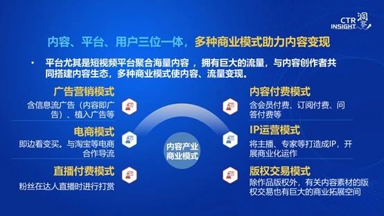 內(nèi)容、平臺(tái)、用戶(hù)三位一體,發(fā)展出多種商業(yè)模式助力內(nèi)容變現(xiàn)。以往媒體僅僅是依靠廣告進(jìn)行變現(xiàn),現(xiàn)在短視頻借助一系列技術(shù)手段不僅可以通過(guò)廣告變現(xiàn)(廣告依然是其重要的盈利模式),還可以通過(guò)帶貨方式如電商模式變現(xiàn),通過(guò)打賞如直播付費(fèi)模式變現(xiàn),此外也可以通過(guò)版權(quán)交易模式變現(xiàn)等。