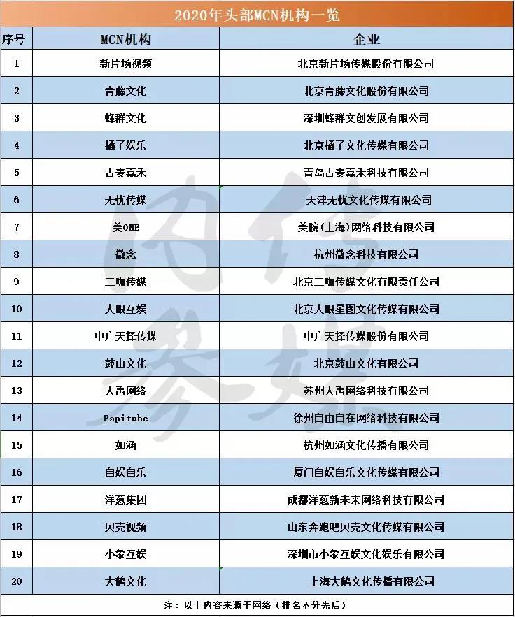 目前,國內(nèi)的MCN機(jī)構(gòu),其大多數(shù)都是在早期由一些頭部紅人、內(nèi)容工作室、自媒體廣告公司、平臺簽約達(dá)人等內(nèi)容行業(yè)的不同角色演變而來的。它們多在自身發(fā)展的過程中,應(yīng)行業(yè)發(fā)展和規(guī)?;?yīng)驅(qū)使,逐漸形成了不同類型的MCN機(jī)構(gòu)。由2017年的內(nèi)容型、電商型、營銷型公司,到2019年逐漸演化出了自制型、孵化型,以及簽約型。據(jù)相關(guān)媒體統(tǒng)計,截止2020年3月,國內(nèi)成型的MCN機(jī)構(gòu)已超過五萬家,并誕生了一批像新片場、貝殼視頻、蜂群文化、無憂傳媒、青藤文化等頭部MCN機(jī)構(gòu)。