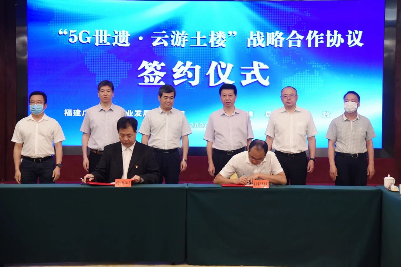 簽約儀式上,福建廣電網(wǎng)絡(luò)實(shí)業(yè)發(fā)展有限公司總經(jīng)理程勇與南靖縣副縣長邵華凱代表雙方在“5G世遺·云游土樓”戰(zhàn)略合作協(xié)議上簽字。