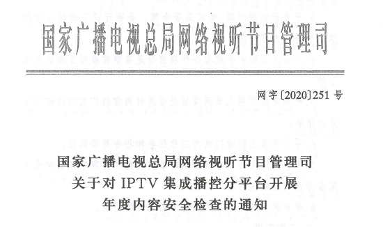 近日,國家廣播電視總局網(wǎng)絡(luò)視聽節(jié)目管理司發(fā)布《國家廣播電視總局網(wǎng)絡(luò)視聽節(jié)目管理司關(guān)于對IPTV集成播控分平臺開展年度內(nèi)容安全檢查的通知》(網(wǎng)字[2020]251號),要求各省廣電行政部門組織對屬地IPTV集成播控分平臺開展年度內(nèi)容安全檢查,檢查涉及節(jié)目源管理、內(nèi)容是否合規(guī)、頻道/專區(qū)是否合規(guī)等多個項目,要求檢查結(jié)果按評價體系形成檢查結(jié)論——分“良好”“合格”“不合格”三類。檢查結(jié)果將按程序予以公示,供相關(guān)機構(gòu)和人員查詢,并作為平臺相關(guān)許可證換發(fā)或申領(lǐng)的重要依據(jù)。