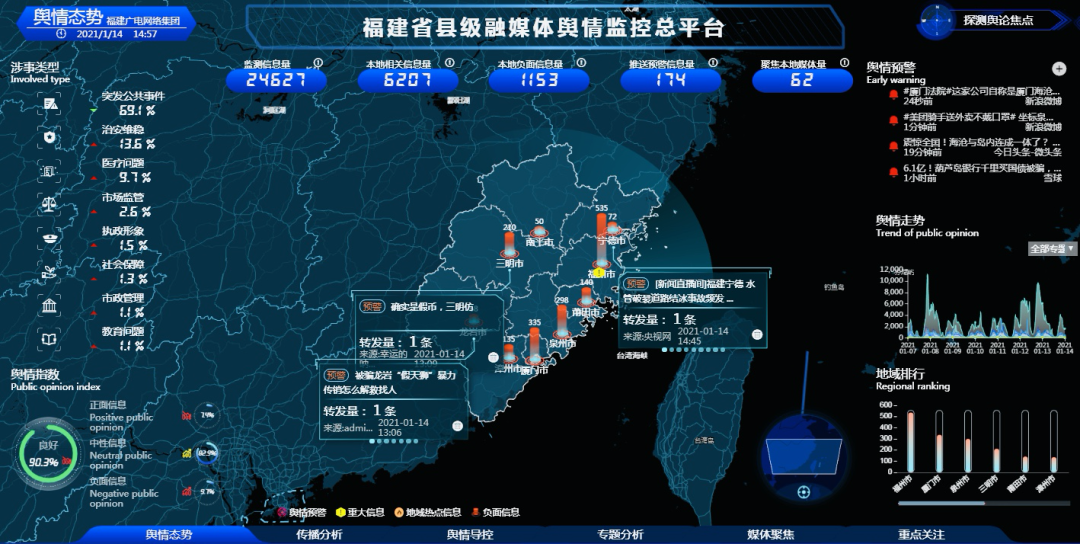 在省委宣傳部的關(guān)心和指導下,福建廣電網(wǎng)絡集團構(gòu)建的福建省縣級融媒體總平臺,以內(nèi)容建設為根本、先進技術(shù)為支撐、創(chuàng)新管理為保障,迅速推動福建省媒體融合向縱深發(fā)展。截至目前,全省 84 個縣(區(qū))全部完成省級平臺接入。省級平臺建成的融媒 APP 云工場、輿情監(jiān)測預警和大數(shù)據(jù)分析云平臺處于行業(yè)領先水平。