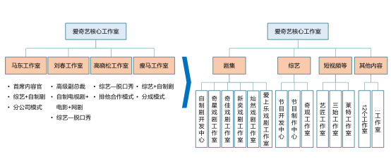 伴隨著業(yè)務發(fā)展,愛奇藝逐步確立了以會員模式為主導,做強自制內容的戰(zhàn)略方向,其工作室制也采用了“化整為零”的進化方式,根據劇集、綜藝、短視頻等不同的內容方向進行了細分。