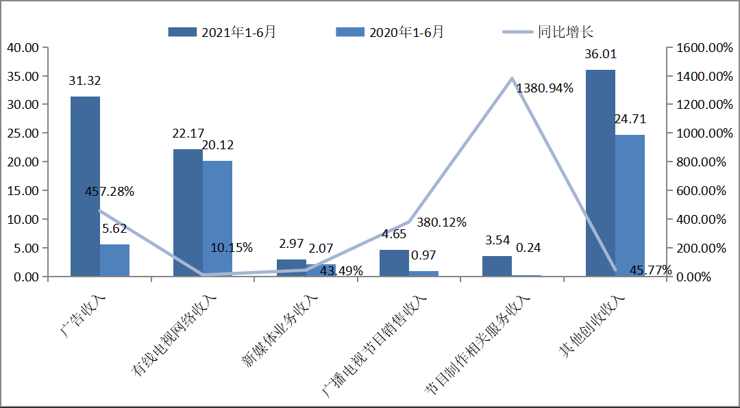 根據(jù)今年第二季度福建省廣播電視統(tǒng)計季報數(shù)據(jù),截至2021年6月,福建省廣播電視實際創(chuàng)收100.67億元,同比增長86.31%。其中,廣告收入31.32億元,同比增長457.28%;有線電視網(wǎng)絡(luò)收入22.17億元,同比增長10.15%;新媒體業(yè)務(wù)收入2.97億元,同比增長43.49%;廣播電視節(jié)目銷售收入4.65億元,同比增長380.12%;節(jié)目制作相關(guān)服務(wù)收入3.54億元,同比增長1380.94%;其他創(chuàng)收收入36.01億元,同比增長45.77%。福建省廣播電視持證節(jié)目制作機構(gòu)1133家,同比增長47.95%。