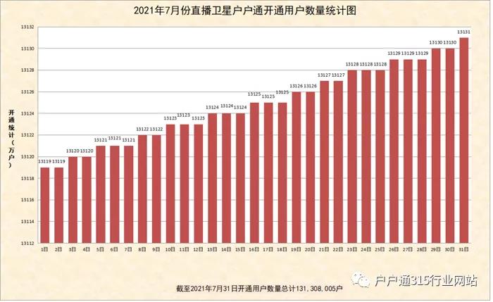 根據(jù)廣電總局發(fā)布的直播衛(wèi)星戶戶通開通用戶數(shù)量統(tǒng)計(jì)圖計(jì)算,截止2021年7月31日全國戶戶通累計(jì)開通用戶數(shù)量13131萬戶(1億3131萬戶),比上月底6月30日的13119新增12萬戶,平均每天開通0.39萬戶,合每天開通3900戶。比上個(gè)月的開通數(shù)量速度略有增加。