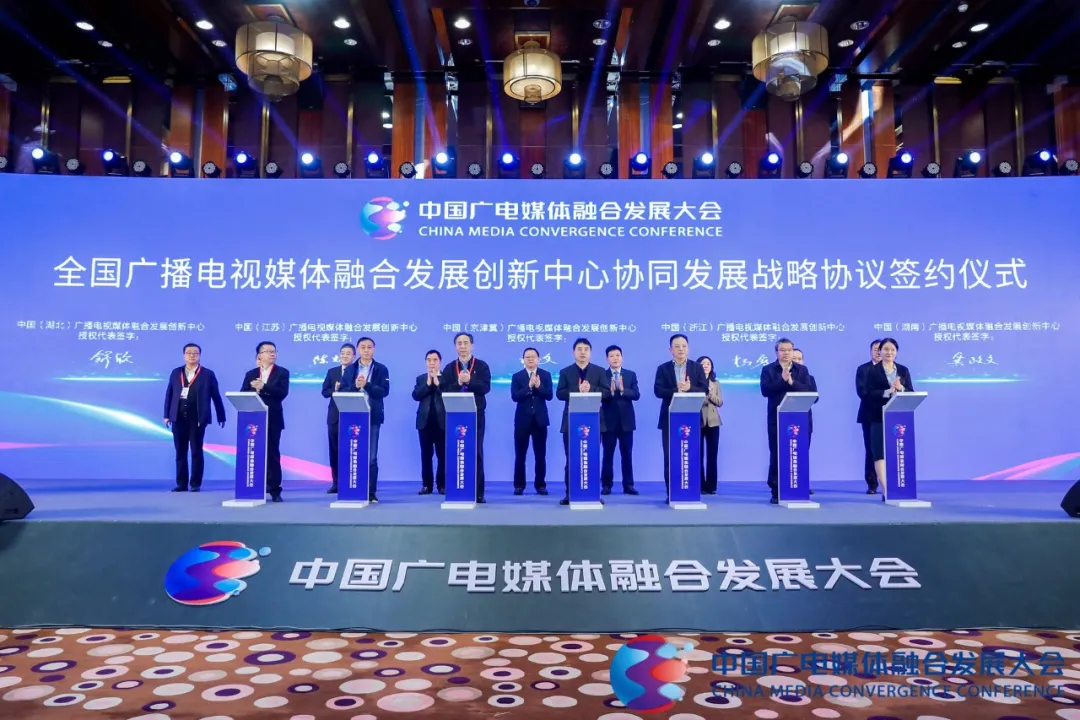 圖為:全國(guó)廣播電視媒體融合發(fā)展創(chuàng)新中心協(xié)同發(fā)展戰(zhàn)略協(xié)議簽約儀式