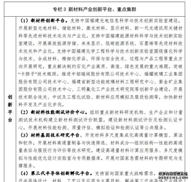 電子信息材料。圍繞集成電路、新型顯示、第三代半導(dǎo)體領(lǐng)域需求,突破一批高端產(chǎn)品生產(chǎn)技術(shù),填補國內(nèi)空白。圍繞半導(dǎo)體產(chǎn)業(yè)配套需求,發(fā)展光刻膠、高純試劑、電子氣體、封裝材料等電子專用化學(xué)品。依托中國科學(xué)院福建物質(zhì)結(jié)構(gòu)研究所,鞏固提升激光晶體、磁光晶體、半導(dǎo)體發(fā)光材料等光電子材料技術(shù)優(yōu)勢。依托省內(nèi)龍頭企業(yè),發(fā)展以氮化鎵、碳化硅、鈣鈦礦為代表的第三代半導(dǎo)體材料。依托將樂軍民融合第三代半導(dǎo)體晶體研究中心等創(chuàng)新平臺,研發(fā)、生產(chǎn)第三代寬禁帶半導(dǎo)體晶體材料。