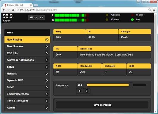 INOmini635是自帶有瀏覽器頁面的用于遠程信號監(jiān)測FM信號接收器。將它部署在發(fā)射機站點或任何關鍵地理位置,它能夠收集信息并把無線電音頻或有線音頻發(fā)送到任何計算機,平板電腦或移動設備。瀏覽器頁面能實現(xiàn)遠程調整,顯示音頻電平以及RDS數(shù)據,并記錄信號參數(shù)。參數(shù)和警報可通過電子郵件,短信和SNMP協(xié)議發(fā)送。INOmini635還支持滾動監(jiān)測Station Rotation?,能夠遍歷儲存的預設并根據各自的設定發(fā)送報警。歡迎前來體驗INOmini635強大的遠程控制,只需按照在Web瀏覽器此鏈接即可全權控制一臺位于美國加州的儀器:model635.no-ip.org,進入網頁后您將看到效果如下圖。您也可以點擊播放按鈕來收聽實時廣播。