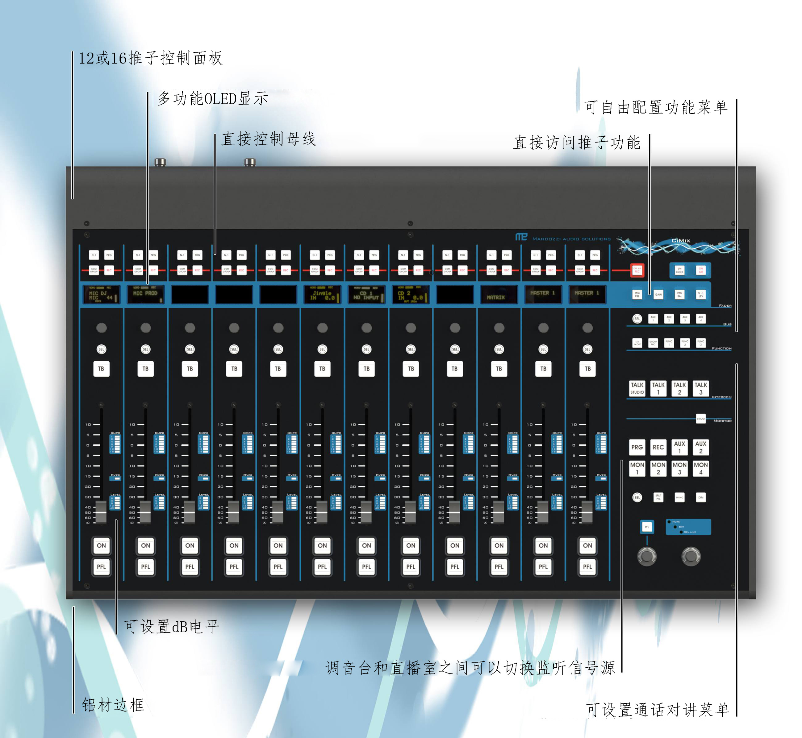CiMix由具有12個(gè)推子的實(shí)體鋁控制臺(tái)和多用途觸摸屏顯示器組成。CIMIX也提供模塊化控制面板,可以嵌入式安裝定制直播桌內(nèi)。帶路由切換和DSP電路的中心處理器被集成在IU19英寸機(jī)箱內(nèi)。