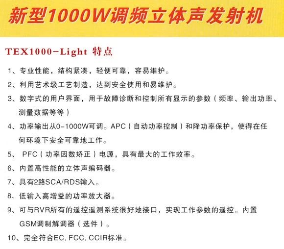 產(chǎn)品簡介:TEX1000 1KW一體化調(diào)頻發(fā)射機(jī)