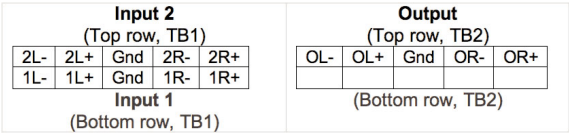 音頻輸入可能平衡或不平衡。 當使用不平衡電源時,將+輸入饋入,并將負(–)輸入跨接至GND。 使用單聲道源時,將左右輸入捆綁在一起,并觀察正確的立體聲相位。