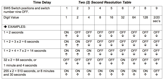警報延遲時間段是有效音頻失敗到觸發(fā)警報之間的時間。 SilenceSentinel?Standard的警報時間延遲是使用設(shè)備背面SW5撥碼開關(guān)的前9個位置設(shè)置的。下表提供了兩種第二分辨率設(shè)置。要提供更長的時間分辨率,請打開SW5開關(guān)9,這將提供20秒的分辨率。對于出廠默認設(shè)置,如下面的兩秒分辨率表所示,我們已將開關(guān)1和2設(shè)為ON。每個開關(guān)都有一個數(shù)字值,如下兩表所示。請遵循下面的兩秒分辨率表。我們將這些數(shù)字值相加以獲得總數(shù)字值。總數(shù)字值乘以分辨率值(兩秒或二十秒)即可獲得延遲時間。