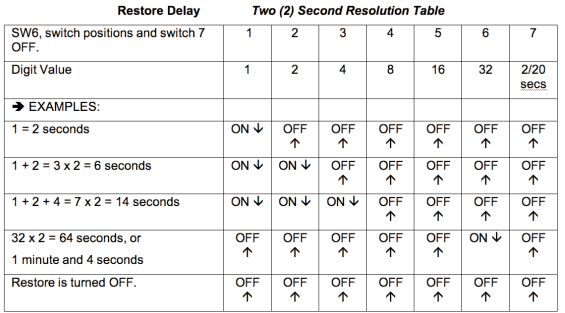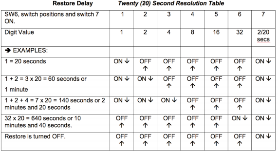 恢復(fù)期是從有效音頻返回到清除警報之間的時間。 SilenceSentinel?Standard恢復(fù)時間延遲位于設(shè)備背面SW6撥碼開關(guān)的前7個位置。 上=關(guān),下=開。下表提供了兩種第二分辨率設(shè)置。 要提供更長的時間分辨率,請打開SW6開關(guān)7,它將提供20秒的分辨率。 所有七個開關(guān)在出廠時均設(shè)置為OFF,無恢復(fù)延遲。 每個開關(guān)都有一個數(shù)值,如下面的兩個表所示。 請遵循下面的兩秒分辨率表。 總數(shù)字值乘以分辨率值(兩秒或二十秒)即可獲得恢復(fù)延遲時間。 注意:以下表是指恢復(fù)時間延遲(以秒為單位)。