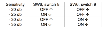 靜音傳感器的跳閘級別從零dBu開始。 撥碼開關(guān)SW6上的開關(guān)8和9用于設(shè)置靜音傳感器跳閘級別。 出廠默認設(shè)置為兩個開關(guān)均為OFF(-20)。 對于大多數(shù)安裝,我們建議將跳閘級別設(shè)置為-25。