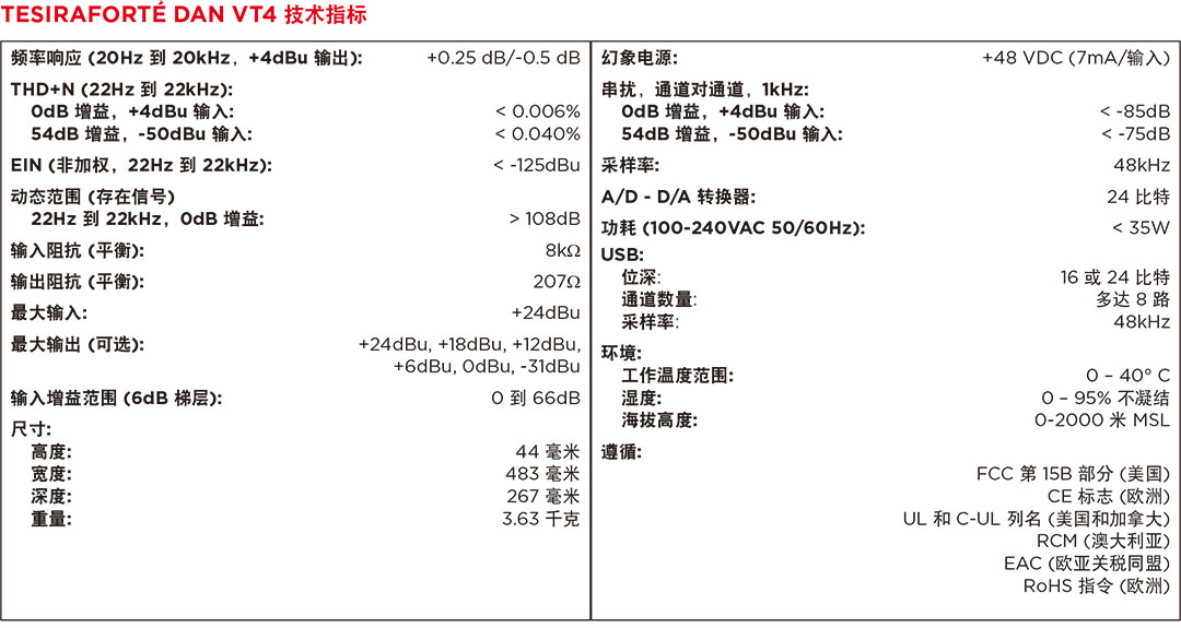 TesiraFORTé? DAN VT4是一款固定的I/O DSP,配備32個(gè)Dante?數(shù)字音頻雙向通道,12路支持回聲消除(AEC)的模擬輸入和4路模擬輸出,并包含多達(dá)8個(gè)可配置的USB音頻通道,一個(gè)雙通道VoIP接口和一個(gè)標(biāo)準(zhǔn)FXO電話接口。借助USB音頻,TesiraFORTé直接與USB音頻主機(jī)連接,并可充分利用當(dāng)今最先進(jìn)的會(huì)議解決方案。TesiraFORTé DAN VT4還提供了廣泛的音頻處理,包括但不限于:信號(hào)路由和混音、均衡、濾波、動(dòng)態(tài)和延遲以及控制、監(jiān)控和診斷工具,均通過(guò)Tesira軟件配置。TesiraFORTé DAN VT4最適合需要使用VoIP、放大聲音、混音和AEC的高品質(zhì)音頻解決方案的房間。