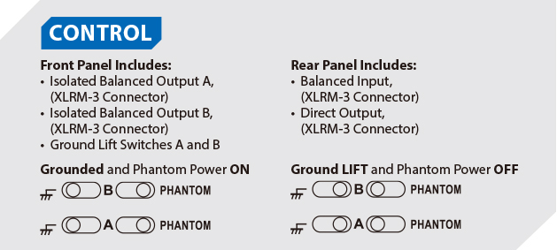 線路分配器的每一通道均分別設(shè)有三組輸出:1 組直接輸出、2 組變壓器隔離輸出、而該 2 組變壓器隔離輸出 (A及B) 亦同樣設(shè)有地線分離選擇開關(guān),可幫助解決因地線回路產(chǎn)生的噪音。將開關(guān)推向左時,地線會設(shè)定分離;而將開關(guān)向右時,地線將會設(shè)定為連接。