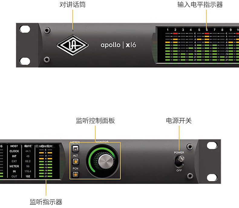 阿波羅 UA Apollo X16 音頻接口具有內(nèi)置的前面板監(jiān)視功能,包括對(duì)講麥克風(fēng)Alt揚(yáng)聲器和可分配的Dim或Mono控制憑借7.1環(huán)繞聲監(jiān)控支持,對(duì)于從事視頻游戲,電視和網(wǎng)絡(luò)音頻和音樂(lè)工作的工程師和制作人來(lái)說(shuō)是一個(gè)福音此外也可與專業(yè)調(diào)音臺(tái)和其他專業(yè)音頻設(shè)備實(shí)現(xiàn)開箱即用的兼容性