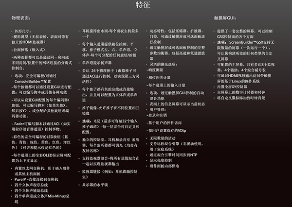 惠斯通的新GSX控制臺(tái)將控制界面配置提高到一個(gè)新的水平。GSX遠(yuǎn)遠(yuǎn)超出了通常的“任何推子的任何來(lái)源”的網(wǎng)絡(luò)概念,它是一個(gè)完全靈活的控制接口,其中每個(gè)開(kāi)關(guān)和旋轉(zhuǎn)控制均可編程以執(zhí)行任何所需的功能。這意味著控制臺(tái)體系結(jié)構(gòu)可以完全根據(jù)客戶要求進(jìn)行自定義,并且功能限制不再是一個(gè)因素。GSX外形豪華大方,可提供多種不同的外形尺寸,包括臺(tái)面,臺(tái)面嵌入和分開(kāi)的框架(分開(kāi)的部分不限于一個(gè)房間;它們實(shí)際上可以在不同的工作室中使用)。