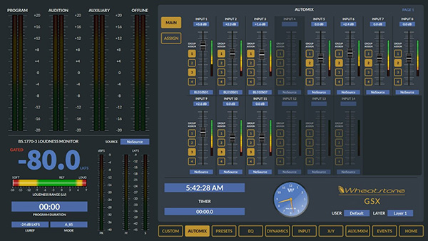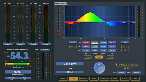 GSX無(wú)縫連接到WheatNet-IP智能網(wǎng)絡(luò),并利用BLADE在單根CAT6互連電纜上傳輸音頻,控制和相關(guān)邏輯數(shù)據(jù)。該系統(tǒng)幾乎可以提取和轉(zhuǎn)換所有音頻格式:麥克風(fēng)和線路電平模擬,AES / EBU,SPDIF,AoIP,MADI,SDI甚至是AES67。包括響度測(cè)量,相位控制和完整的EQ / Dynamics。